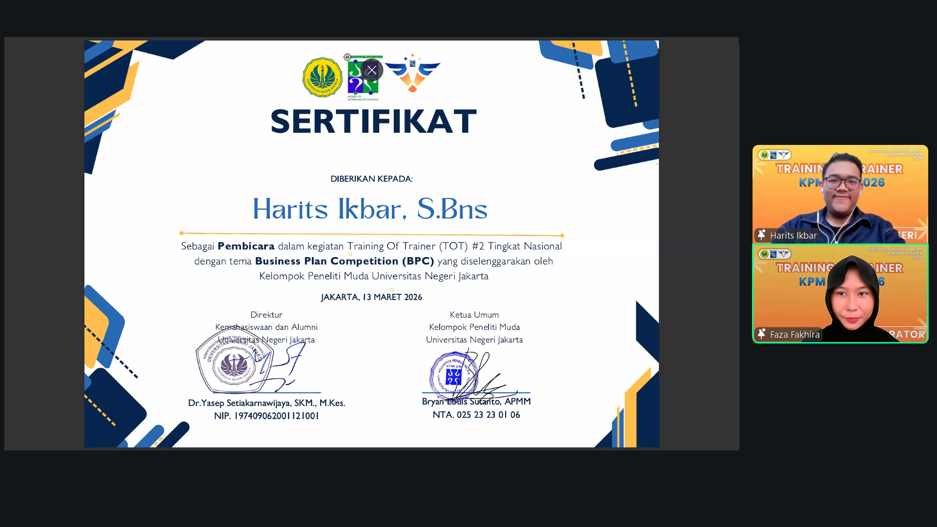 KPM UNJ telah menyelenggarakan Training of Trainer (TOT) bertajuk “TOT #2 Business Plan Competition (BPC)” pada Jum’at, 13 Maret 2026 melalui platform Zoom Meetings. Acara ini diikuti oleh kurang lebih 90 peserta, terdiri dari fasilitator dan peserta umum.